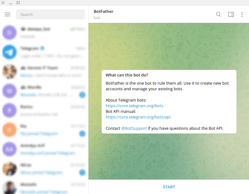 To build a Telegram bot with PrimeX Group WhatsApp, first, open your Telegram App. Then in the search bar of the app, search with the ‘BotFather’ keyword. Then select the verified BotFather account.