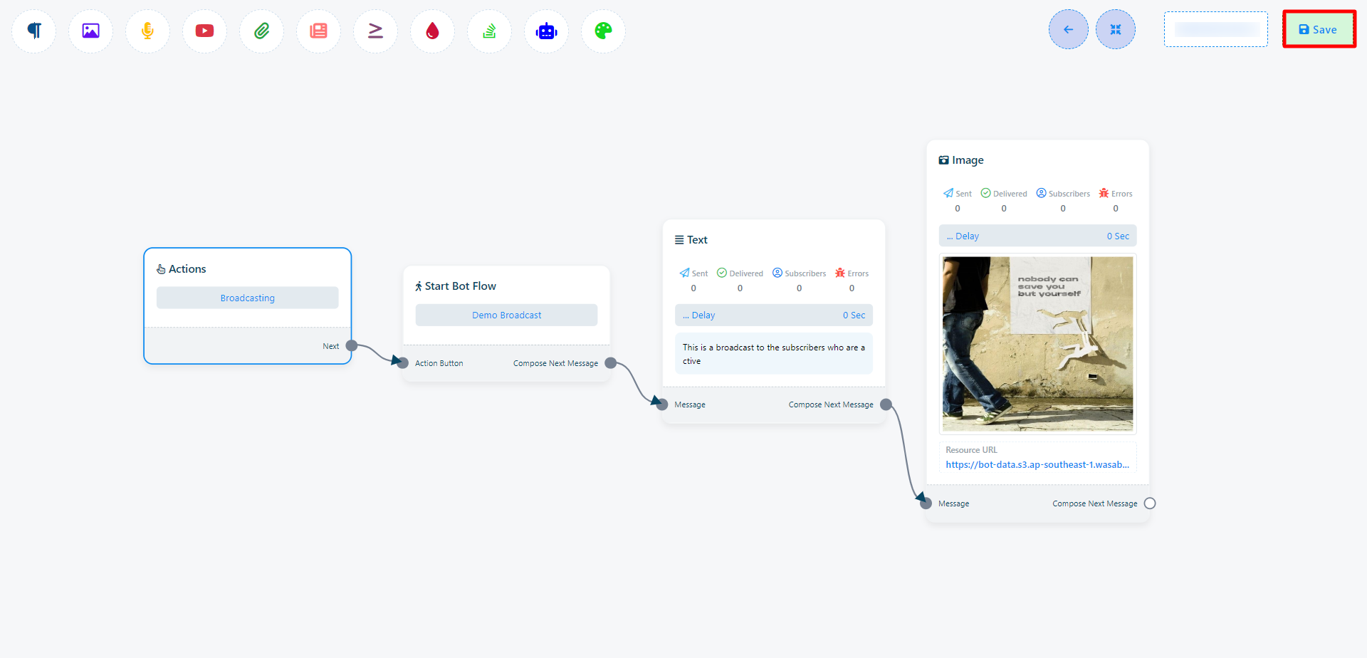 10. Finally, save the bot flow by clicking on the “Save” button on the Visual Flow Builder. The campaign will be created right after hitting the `Save` button.